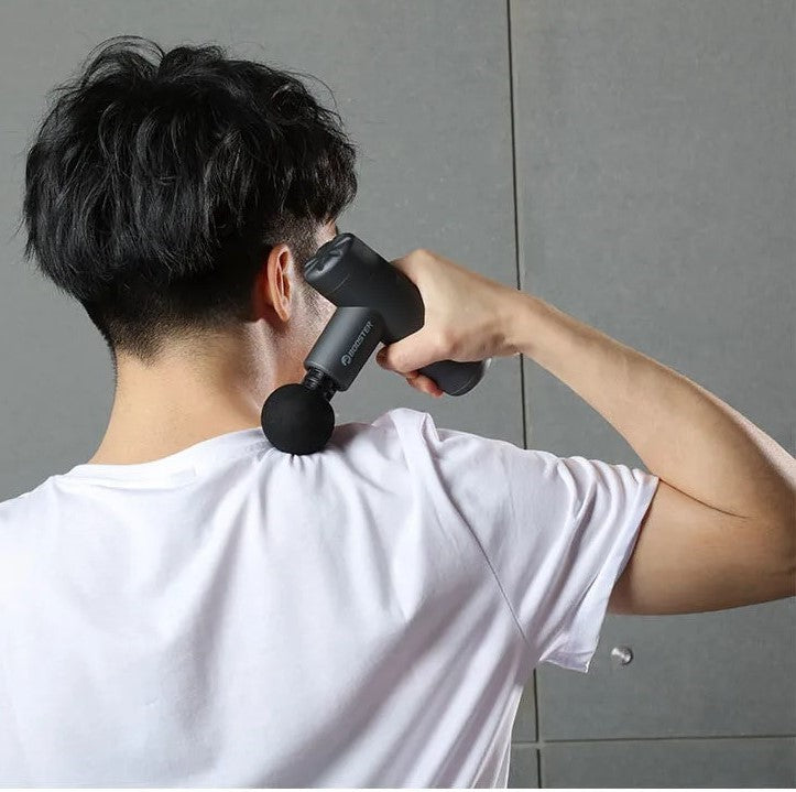 The massage gun uses rapid pulses to increase blood flow and relax tight muscles. This helps reduce soreness and speeds up muscle recovery after workouts.